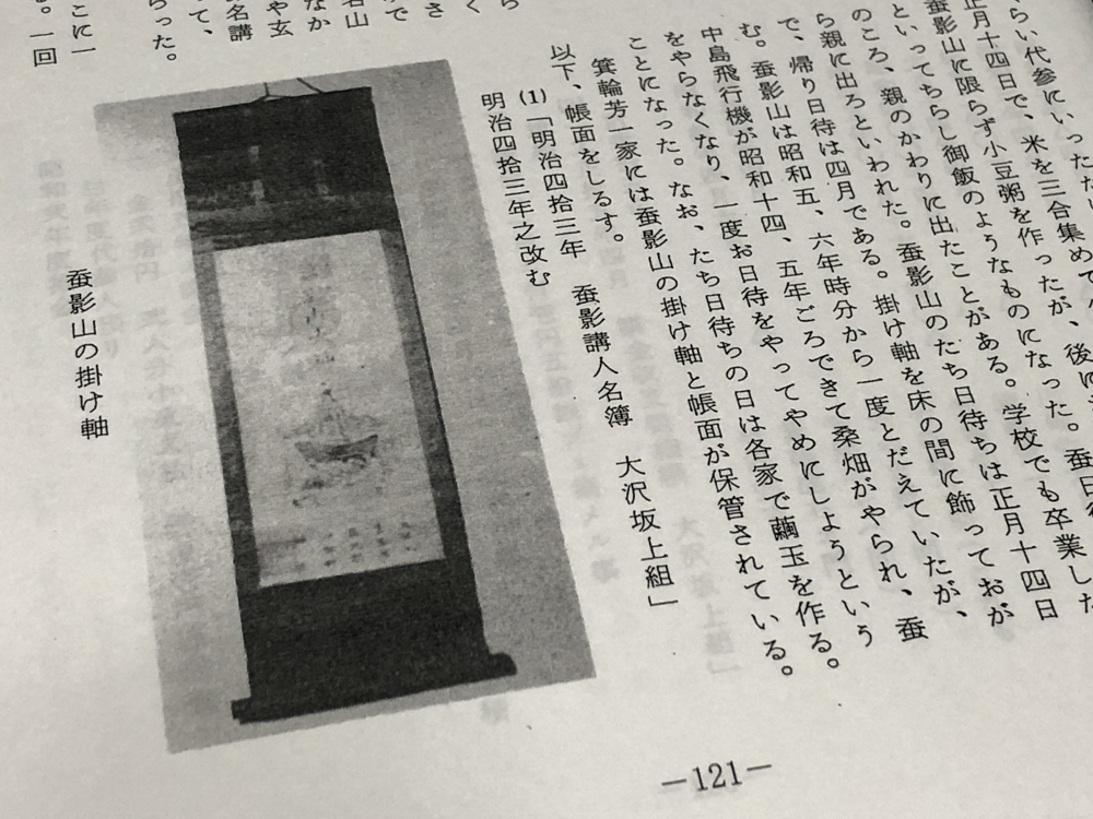 蚕影山の「立ち日待ち」は正月14日で各家で繭玉を作る。「帰り日待ち」は4月である。掛軸を床の間に飾って拝む。