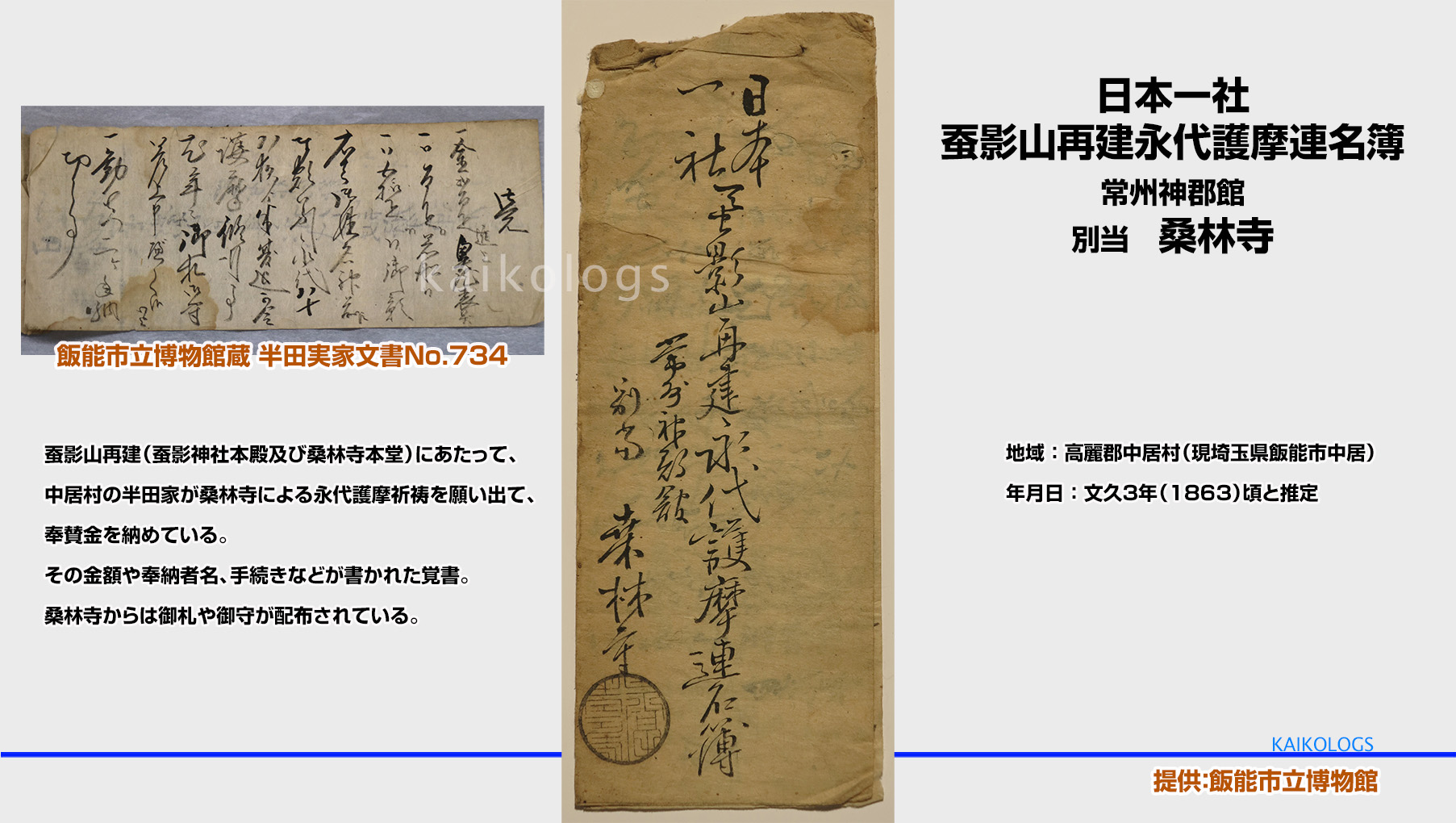 「常州筑波郡神郡桑林寺蚕影山本社建替」に際して、「亥三月 唐戸1枚を寄附、短冊50枚を奉納」した。