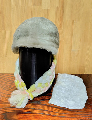 袋真綿を広げて重ねて帽子を 引っ張って組んでマフラーを作りました。