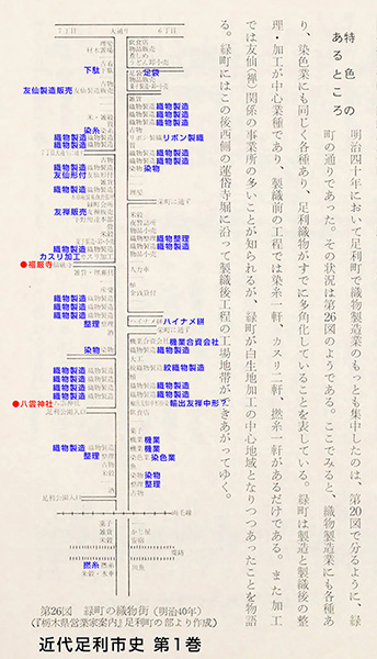 「明治40年において足利町で織物製造業のもっとも集中したのは、緑町の通りであった」とあり、織物街の図をみると、「緑町は製造と製織後の整理・加工が中心業種」だったらしい。