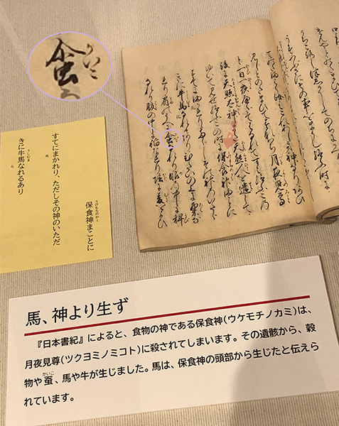 「日本書紀」の展示があって、「保食神(うけもちのかみ)の遺骸から、穀物や蚕、馬や牛が生じました」という部分。