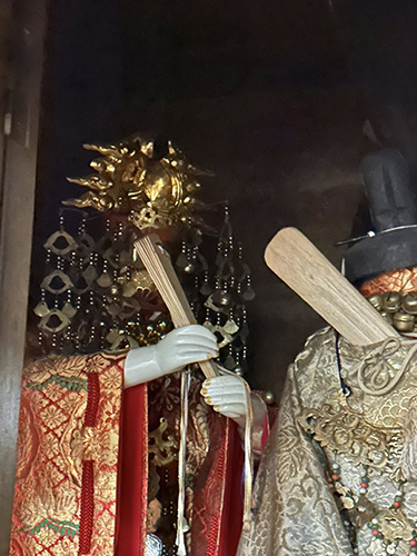 久渡寺に納められたオシラサマには手に笏や檜扇を持ち、胸に瓔珞、頭には冠を付けて豪華に装飾されて、人々の信仰の厚さを感じさせます。