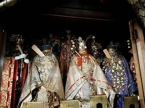 各家で作られた御神体は、頭頂部に真綿(蚕綿)を被せて、印の入った白布と金蘭の布を被せ、首に鈴を付け着飾って祀られる。