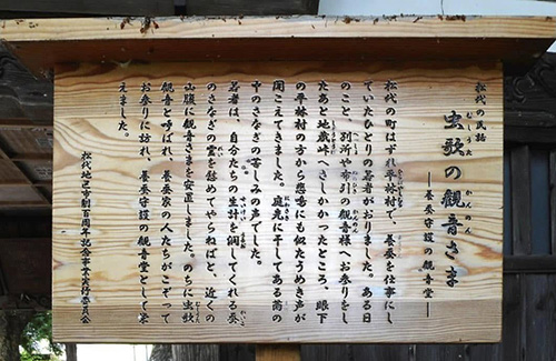若者は、自分たちの生計を潤してくれる蚕のさなぎの霊を慰めてやらねばと、近くの山腹に観音様を安置しました。のちに虫歌観音と呼ばれ、養蚕家の人たちがこぞってお参りに訪れ、養蚕守護の観音堂として栄えました。